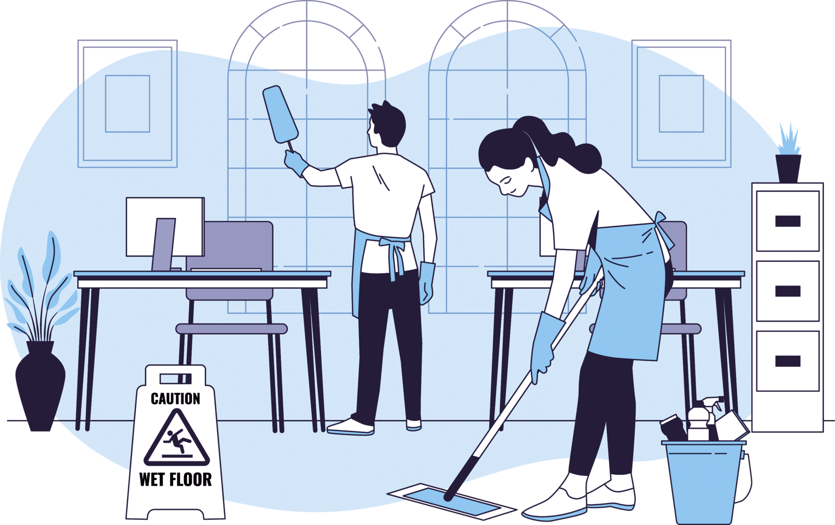Обеспыливание поверхностей; обработка зеркал и перегородок из стекла; удаление пятен; дезинфекция санитарно-технического оборудования.